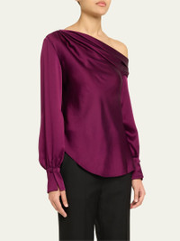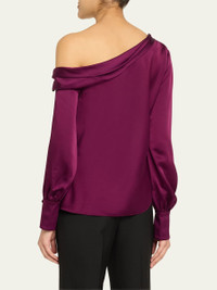 SIMKHAI "Alice" draped satin top One-shoulder neckline Long sleeves with button cuffs Classic fit Hem falls to the hip Pullover style Acetate/polyester Dry clean Imported Online Inquiries: BGS21_T632D| Store Inquiries: #4891519