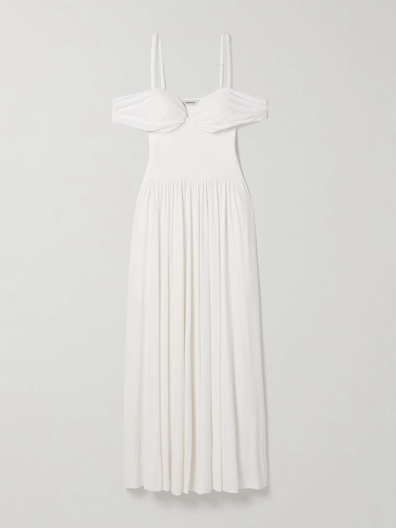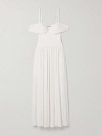 SIMKHAI's Spring '25 collection is inspired by an image of founder Jonathan Simkhai's mother on her wedding day, resulting in beautiful dresses like this 'Amarantha' style. Designed with a smooth knit bodice, it has a pleated stretch-jersey skirt and padded cups. The cold-shoulder neckline is complete with both adjustable and ruched straps. Size & Fit - Fits true to size, take your normal size - Designed to be fitted at the bust and waist, loose at the hip - Mid-weight, stretchy fabric - Model is 175cm/ 5'9" and is wearing a size XSmall Model measurements: - Bust: 75cm/ 29.5" - Waist: 60cm/ 23.5" - Hip: 93cm/ 36.5" Details & Care - Ivory stretch-jersey and knit - Slips on - 96% rayon, 4% spandex; trim: 83% viscose, 17% polyester; lining: 94% rayon, 6% spandex - Dry clean