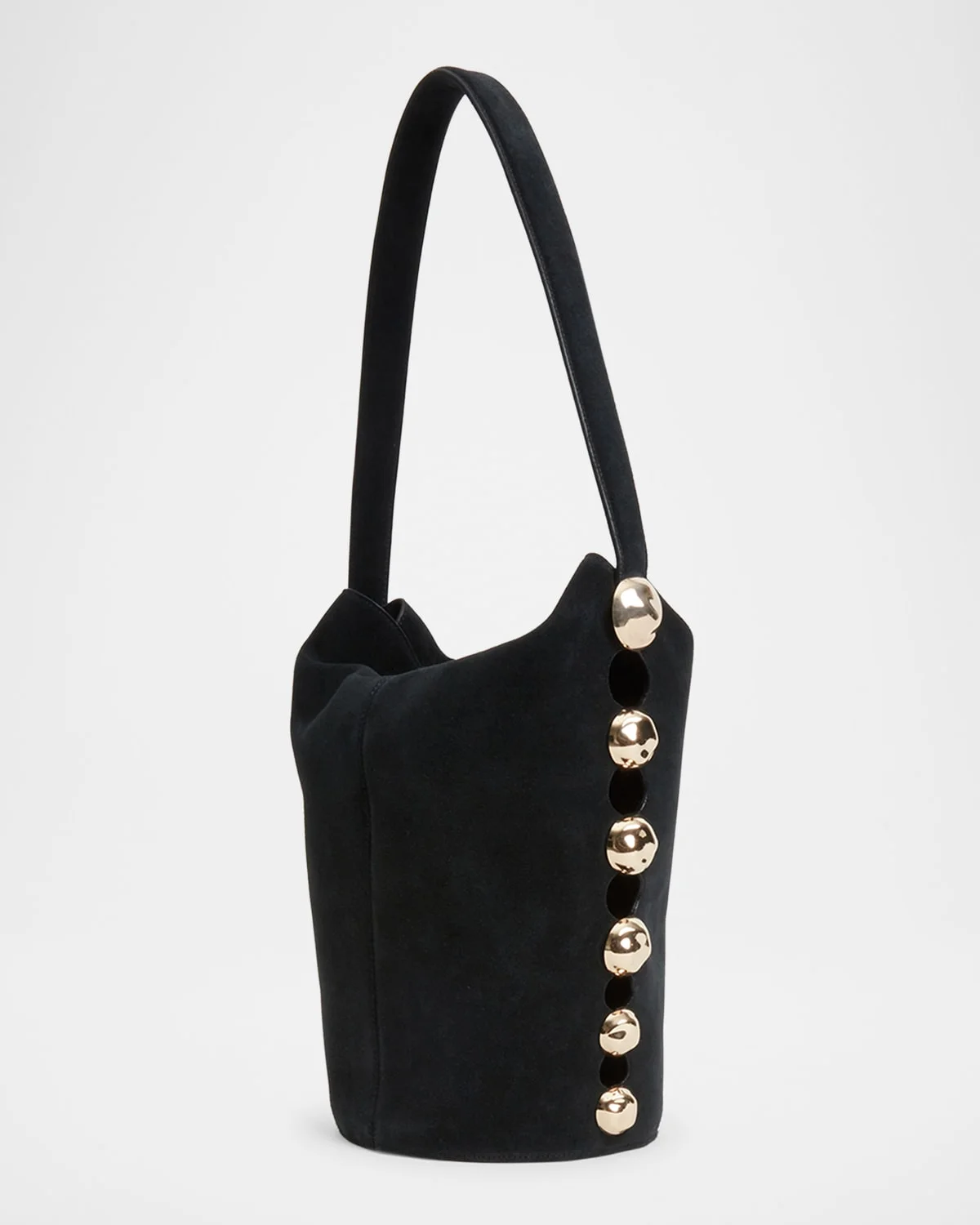 - SIMKHAI "Amaya" bucket bag in leather embellished with graduated metallic studs and side cutouts - Top handles, 8.6" drop - Foldover top - Interior, attached pouch with zip top and slip pocket - Lining: Suede - Approx. 18.2"H x 10.9"W x 5.7"D - Imported