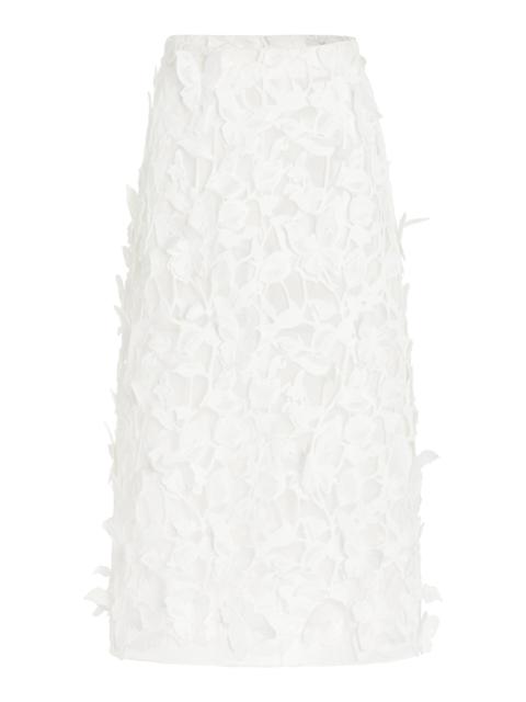 PRODUCT DETAILS - High-waisted, semi-sheer, 3D guipure lace, midi hem - Concealed zip fastening along back - Lined - Composition: 100% Polyester; 85% Polyester, 15% Spandex - Color: White - Dry clean only - Spring/Summer '25