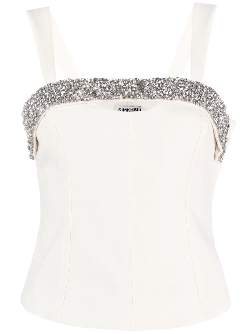 crystal-embellished corset top Highlights - Optical white/silver-tone - Crystal embellishment - Tonal stitching - Corset style - Scoop neck - Sleeveless - Square open back - Curved hem Imported Composition Outer: Acetate 55%, Polyester 45% Lining: Polyester 100% SIZE & FIT Model measurements Height 5 ft 11 in(1.8 m) Bust/Chest 31.49 in(80 cm) Hips 36.22 in(92 cm) Waist 25.59 in(65 cm) FittingInformation Designed for a slim fit that sits just away from the body offering a close yet comfortable fit Made from a midweight non-stretch fabric, this piece offers minimal elasticity when worn This piece fits true to size – take your usual size Washing instructions Dry Clean Only
