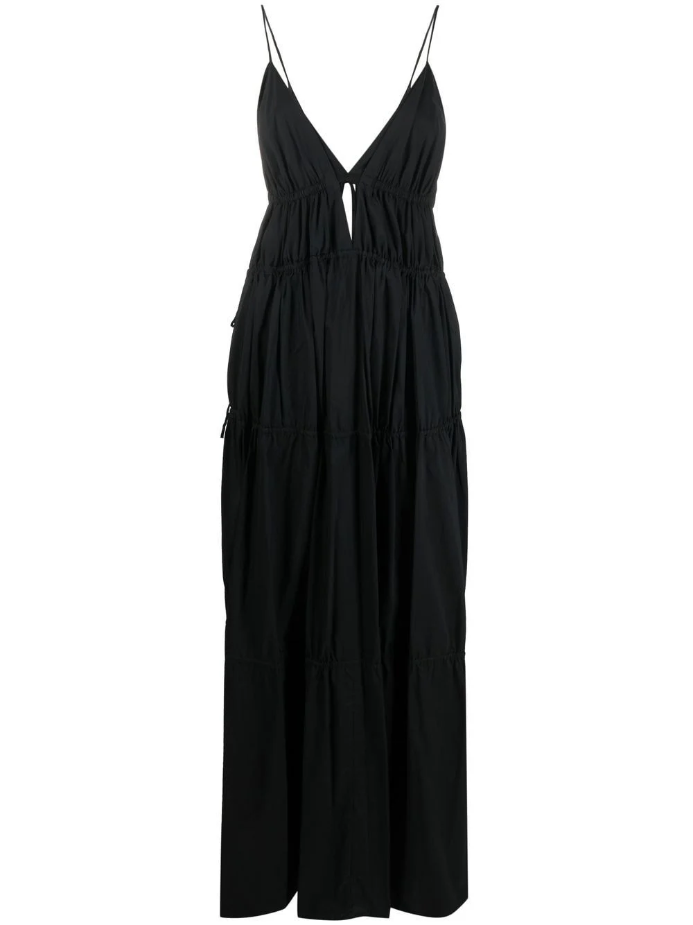 April Core cut-out maxi dress black cotton cut-out detailing plunging V-neck V-back tiered skirt spaghetti straps rear tie fastening side drawstring fastening sleeveless straight hem ankle-length Imported Composition Cotton 100% SIZE & FIT Model measurements Height 5 ft 10 in(1.77 m) Bust/Chest 29.92 in(76 cm) Hips 34.25 in(87 cm) Waist 23.62 in(60 cm) FittingInformation This piece fits true to size. We recommend you get your regular size Made with a mid-weight non-stretch fabric Washing instructions Dry Clean Only