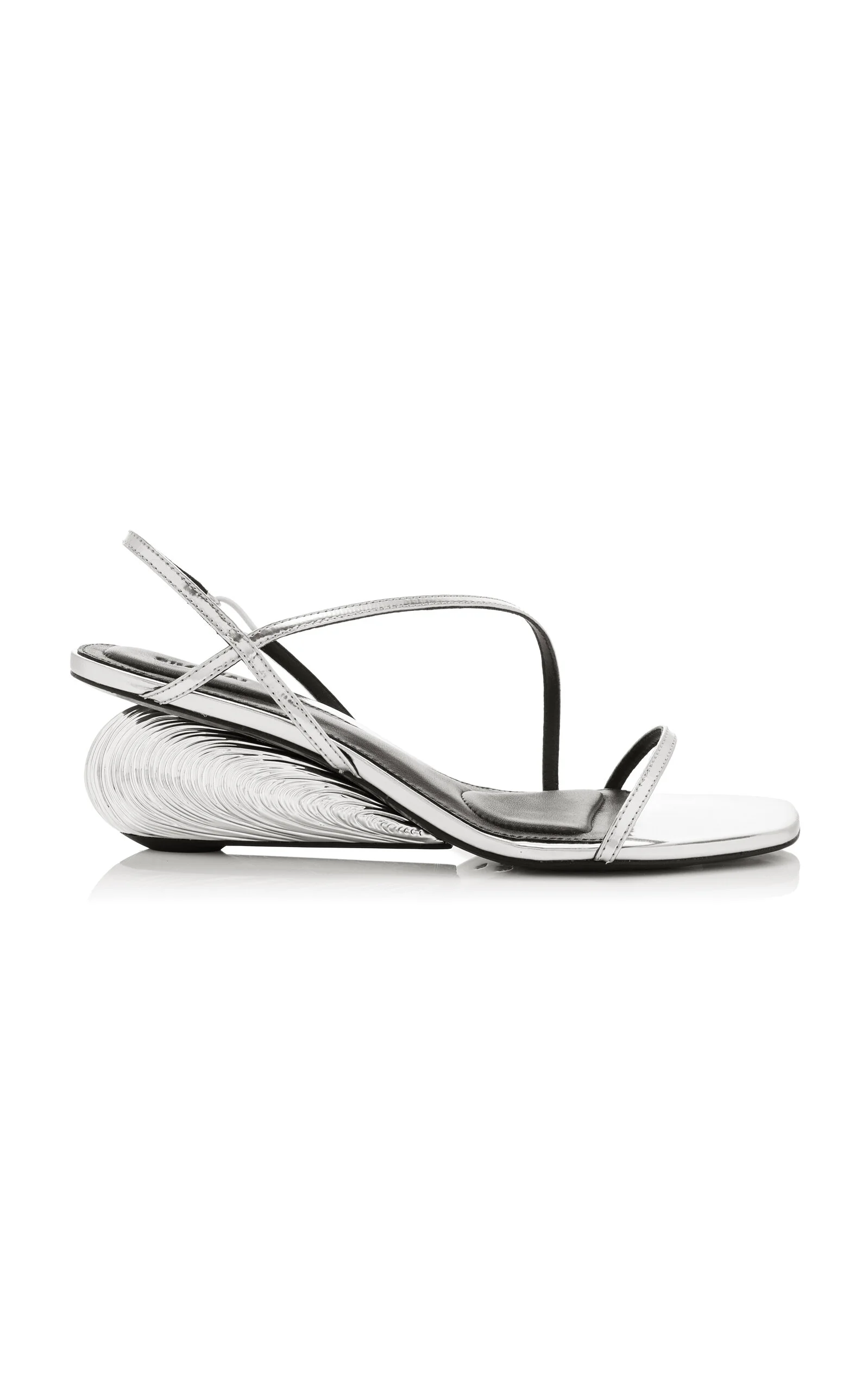 PRODUCT DETAILS - Wedge sandals silhouette, leather body, oyster shell motif heel, asymmetrical upper straps, square toe, lined - Slip on - Composition: upper: 100% calf leather, outsole: 100% cow leather, lining: 100% sheep leather - Imported