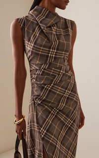 Founded in 2010 by designer Jonathan Simkhai, the studio takes inspiration from architects and sculptors alike, blending progressive construction techniques with intimate hand-detailing to create truly special pieces. The Burke Draped Midi Dress in Chocolate Plaid. A sleeveless midi dress with a cowl neckline and thoughtfully gathered at the sides for an impeccably draped look. PRODUCT DETAILS - Fall '25 - Zip fastening - Composition: 100% polyester - Designer color: Chocolate - Machine wash or dry clean - Imported