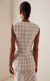 PRODUCT DETAILS - Woven gingham, sleeveless, tailored - Button fastening through front - Lined - Composition: 75% Viscose, 23% Polyester, 2% Elastane; 100% Polyurethane - Color: Sand Gingham - Dry clean only - Spring/Summer '25