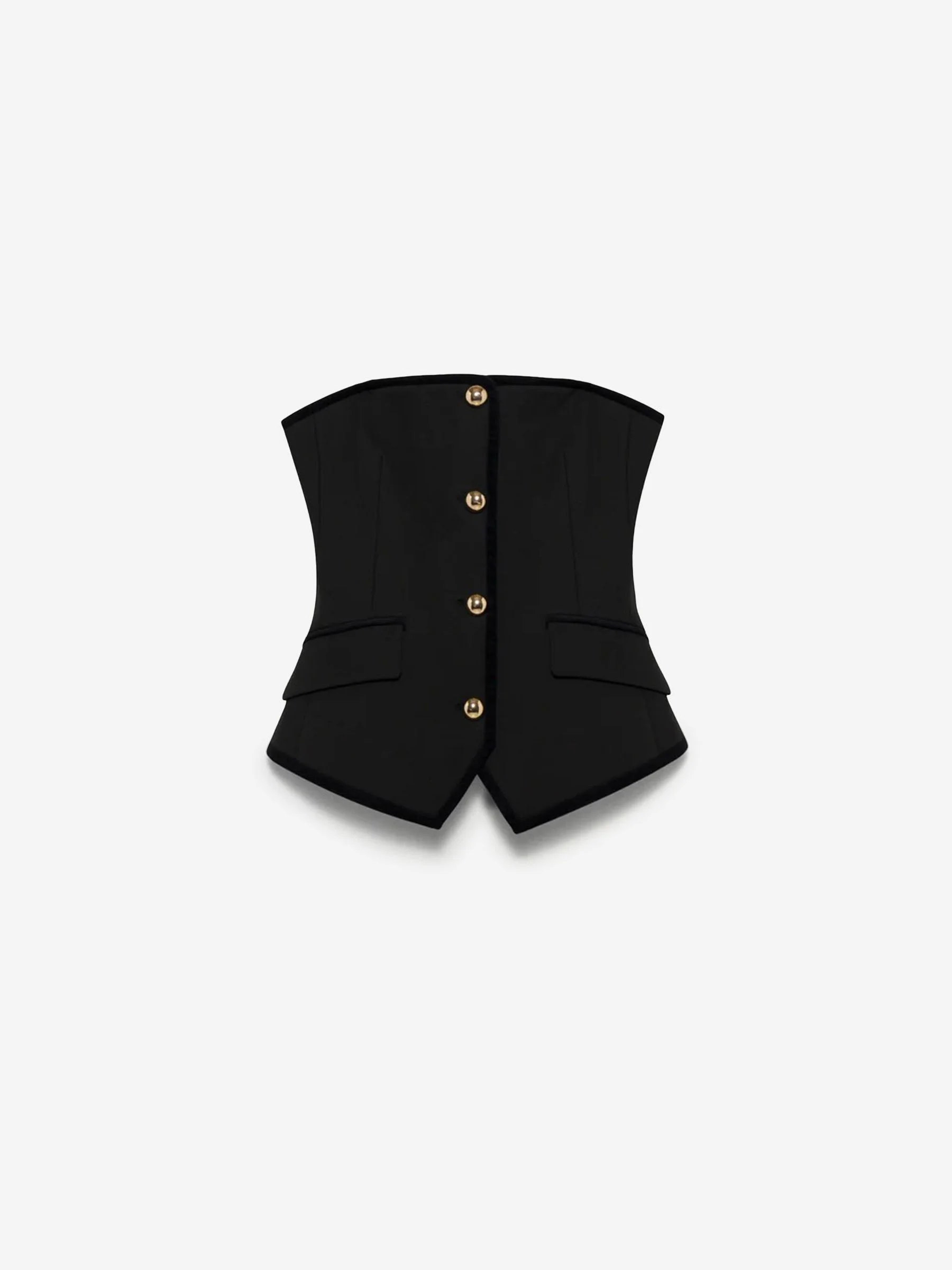 SKU: 703-002490 01 BRAND ID: 625-2130-H Simkhai's Top • Regular fit that flatters the figure • Made of velvet • Top • Tailored design with strapless neckline • Detail of gold buttons on the front • 64% Polyester, 31% Viscose, 5% Elastane, Lining: 100% Polyester • Made in: Italy