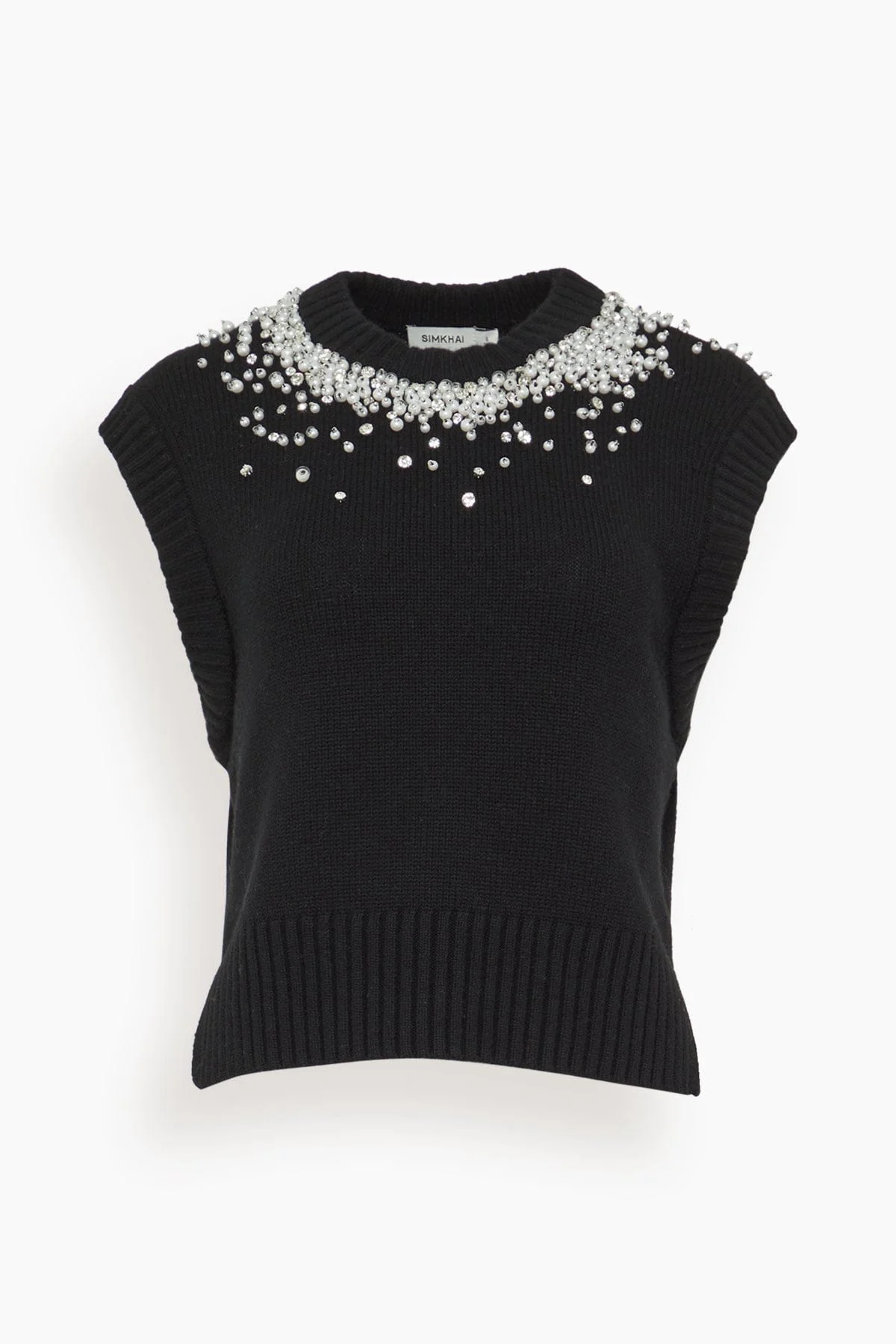 The Simkhai Candra Vest is a beautiful piece from their Resort 26 Collection. This knit vest features a slim silhouette with hand-embellished crystal and faux pearl neckline. Wear yours with trousers and heels. - Knit vest - Slim silhouette - Cropped length - Crystal and faux pearl embellishments - 89% Wool 10% Cashmere 1% Nylon