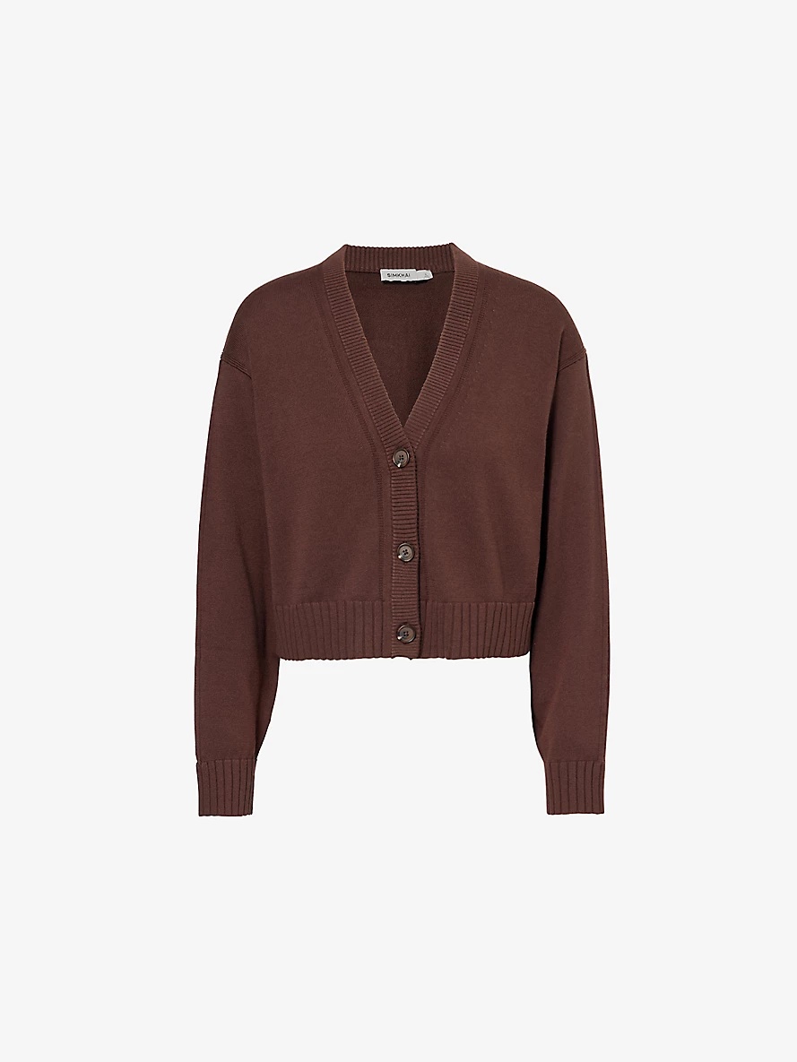 PRODUCT DETAILS - Simkhai cotton and cashmere cardigan - 85% cotton, 15% cashmere - Exposed button fastening mat front - Relaxed fit, V-neck, dropped shoulders, long sleeves, ribbed trims - Dry clean only - True to size - Model is 5ft 10in/1.78m and wears a size small - Midweight, slight stretch Ref: R04395537