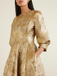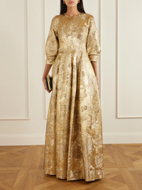 Simkhai's ‘Claravelle' gown is made from shimmering jacquard that catches the light with every movement. The sculpted bodice and gently voluminous sleeves create a striking, architectural line before falling into a sweeping skirt.
