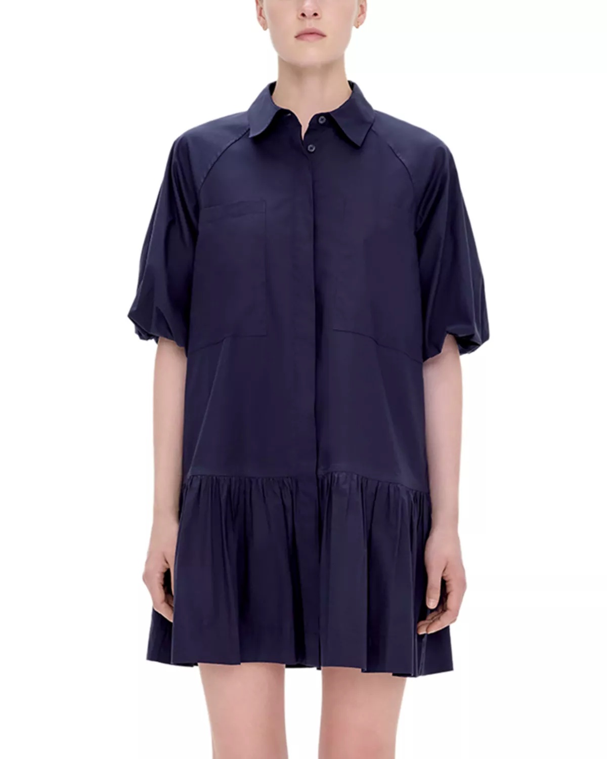 SIZE & FIT - Fits true to size, order your normal size - Relaxed fit - Designed to hit above the knee - Approx. 36" from high point shoulder to hem, based on size small - Model measurements: 5'10" height, 33.5" bust, 23.5" waist, 34.5" hips, wearing a size small PRODUCT DETAILS - Point collar - Short raglan puff sleeves - Concealed front placket - Two front chest pockets - Ruffle hem - Please note that this dress will be delivered with a black b-tag attached, with instructions for removal included. If the b-tag is removed, the dress cannot be returned. - Imported Web ID: 4920712