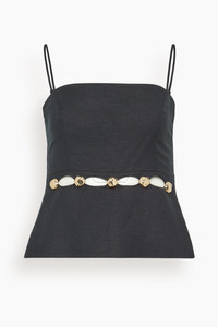 The Simkhai Cruz Cami is a standout piece from their Resort 26 Collection. This cami features a cutout waistline with stud details. Wear yours with the matching pants and sandals. - Cami - Relaxed fit - Cutout waistline - Stud detail - 55% Linen 45% Viscose, Lining: 100% Cotton