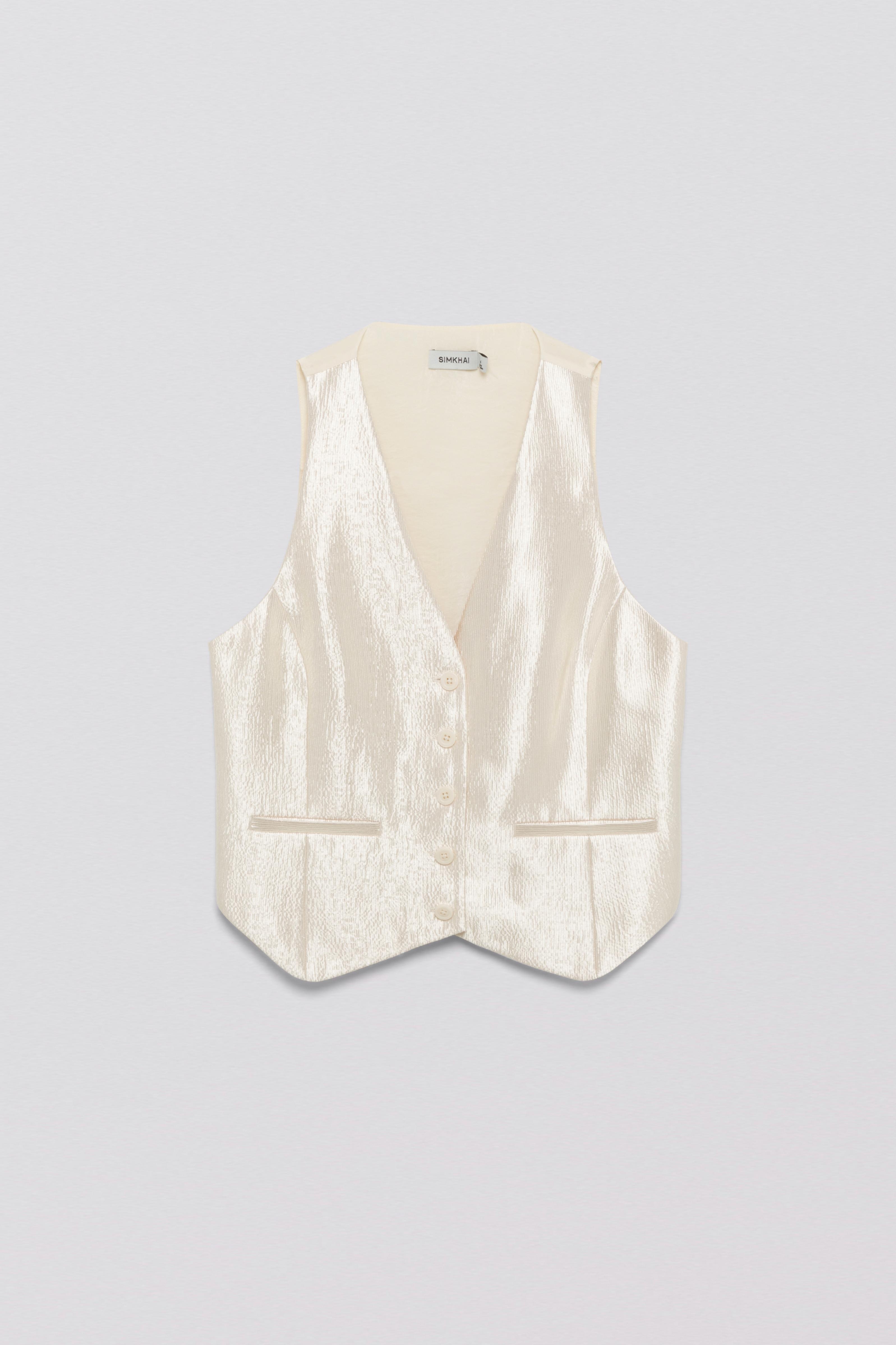 The Simkhai Deb Textured Satin Vest offers the tailored look you love from this designer. This vest has a structured waistline and v-neckline with a metallic sheen. Wear yours with the matching trousers and heels. - Fits true to size, take your normal size - Vest - Tailored silhouette - V-neckline - Structured waistline - Textured material - 60% POLYESTER 40% RAYON, COMBO: 76% RAYON, 24% NYLON, LINING: 100% POLYESTER