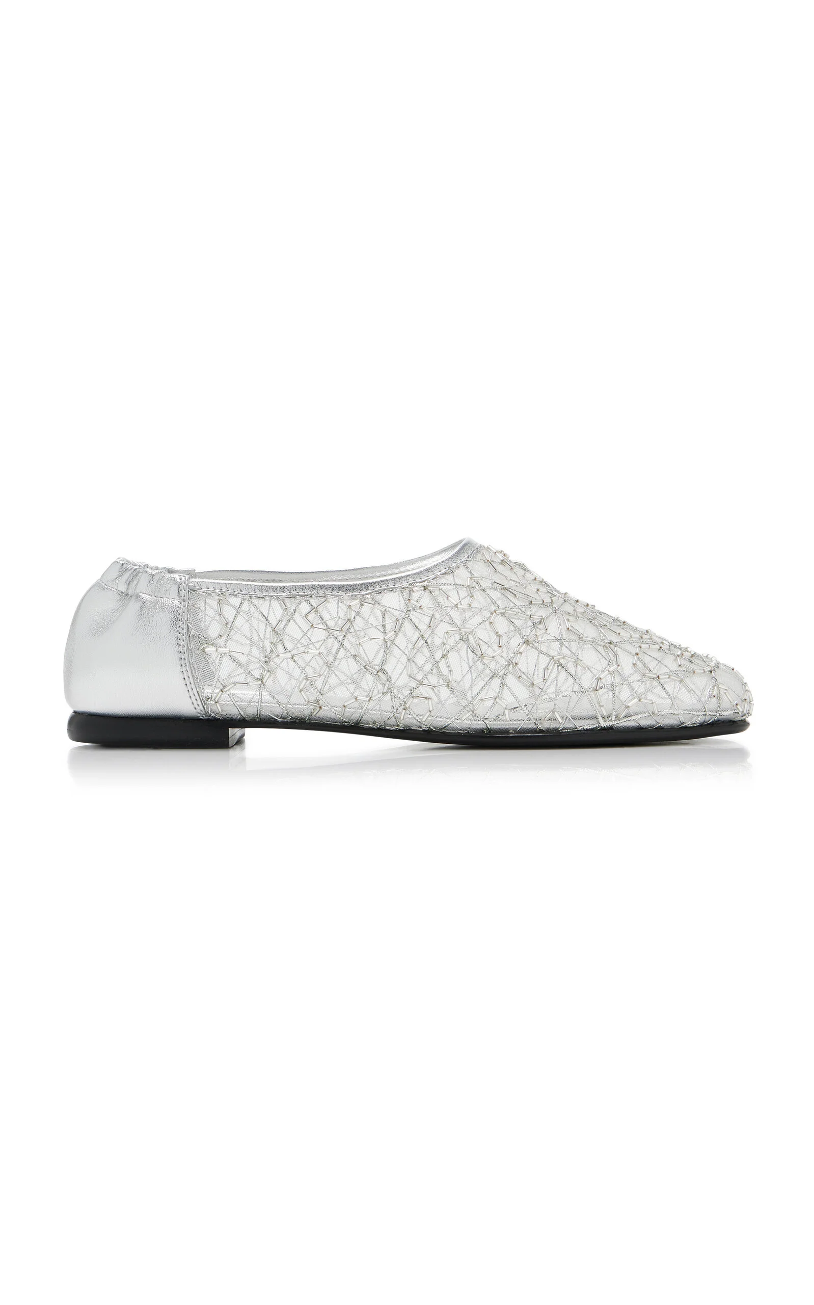 PRODUCT DETAILS - Ballet flats silhouette, mesh body, metallic lace embroidered detail, elastic metallic leather heel, round toe, lined - Slip on - Composition: upper: 100% polyester, outsole: 100% cow leather, lining: 100% sheep leather - Imported