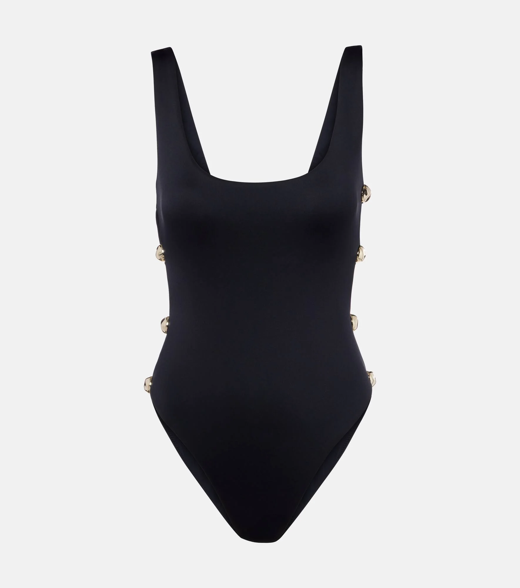 Inspired by sculpture and architecture, Simkhai's designs combine innovative construction with hand-detailing. This one-piece swimsuit features a sleek silhouette with a square neckline and button embellishments at the sides. Product Details - Material: 77% nylon, 23% elastane - Care instructions: hand wash - Made in China - Designer color name: Black - Item color: black - Lining: 85% nylon (recycled), 15% elastane - Includes: dust bag - Item number: P01125158 Size & Fit - True to size - Removable padding - High-cut leg - The model seen in the picture is 178cm-5'10", cup size B, and wearing a size XS