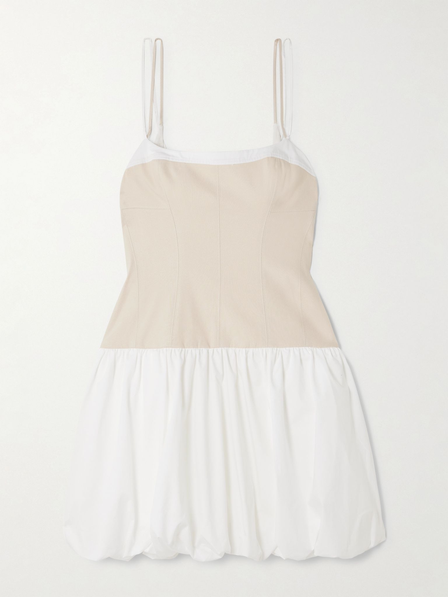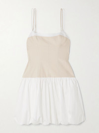 SIMKHAI's Spring '25 takes ideas of summertime nostalgia and updates them for today. This 'Fifi' dress has a structured linen-blend bodice and cotton-blend poplin bubble skirt. Complement the double straps with lace-up sandals. Size & Fit - Fits true to size, take your normal size - Designed to be slightly fitted at the bust and waist, loose at the hip - Mid-weight, slightly-stretchy fabric - Model is 180cm/ 5'11" and is wearing a US 2 Model measurements: - Bust: 80cm/ 31.5" - Waist: 65cm/ 25.5" - Hip: 89cm/ 35" Details & Care - Sand linen-blend, white cotton-blend poplin - Concealed zip fastening along side - Fabric1: 51% linen, 46% rayon, 3% spandex; fabric2: 63% cotton, 37% polyester; lining: 100% cotton - Machine wash