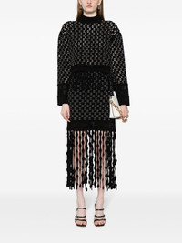 Filippa Lattice fringed skirt Highlights - Black - Knitted construction - Interwoven design - Slip-on style - Fringed edge - Mid-length Imported Composition Rayon 83%, Polyester 15%, Spandex/Elastane 1%, Nylon 1% SIZE & FIT Model measurements Height 5 ft 9 in(1.75 m) Bust/Chest 31.88 in(81 cm) Hips 35.03 in(89 cm) Waist 23.22 in(59 cm) FittingInformation This midi-length skirt is intended to be worn high on the waist The elasticated waist allows for a comfortable fit Made with a midweight knit, this piece offers some stretch This piece fits true to size – take your usual size Washing instructions Hand Wash
