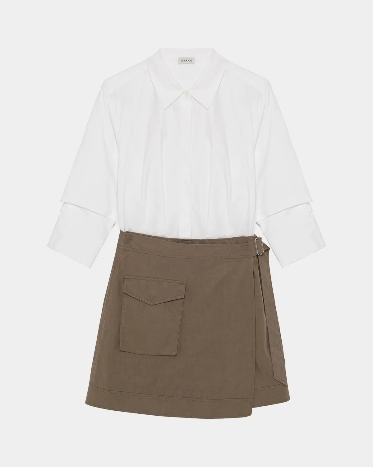 SIMKHAI "Fraser" combo mini dress featuring a wrap cargo skirt Point collar; buttonfront Threequarter sleeves with button cuffs Side flap pocket; back patch pockets Shirtdress silhouette Hem falls above the knee Slipover style Tencel® lyocell/cotton Dry clean Imported