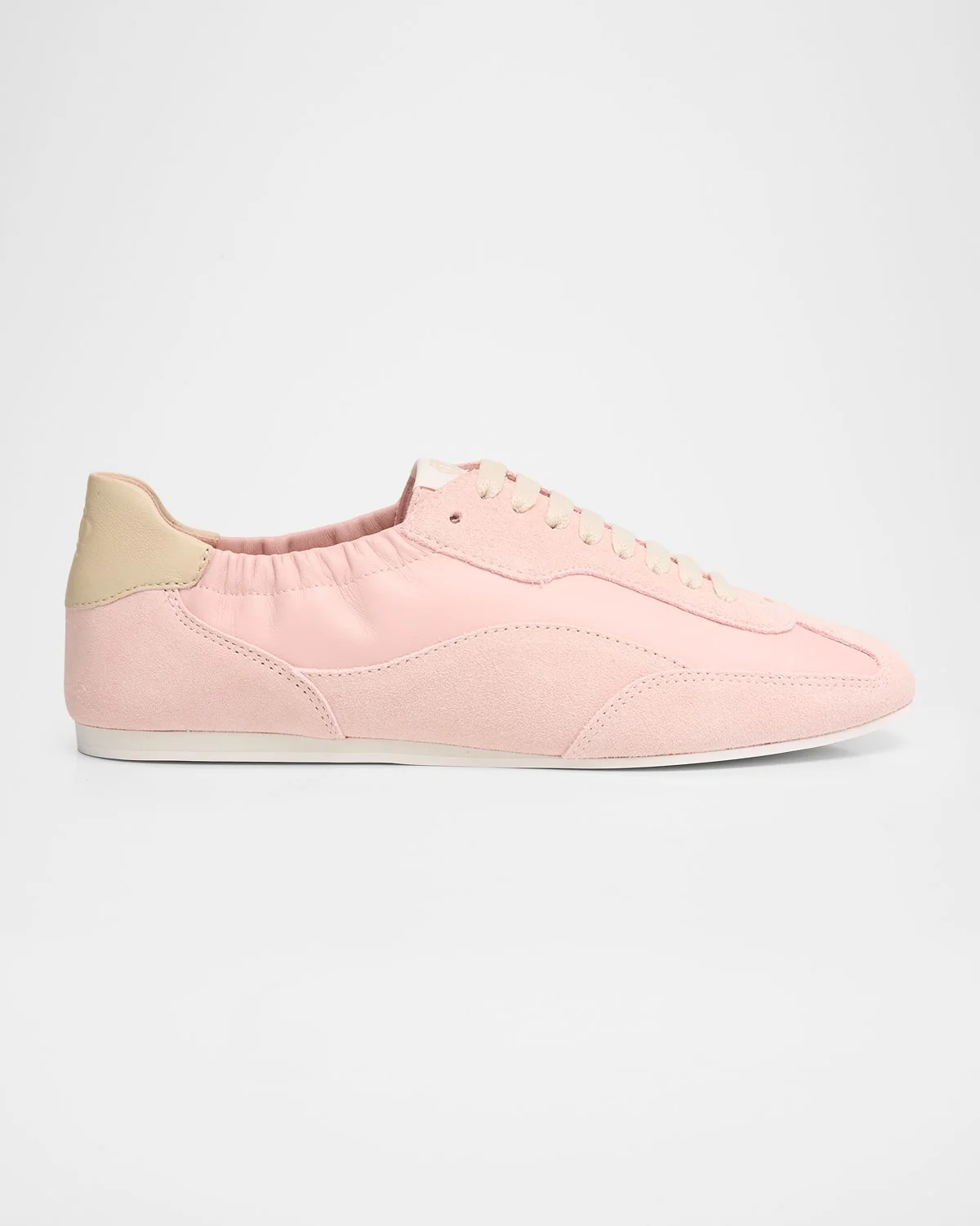 Crafted of soft suede with leather trim, these "Georgie" sneakers from SIMKHAI feature a classic round toe and elasticized sides Flat heel Round toe Laceup vamp Rubber outsole Imported