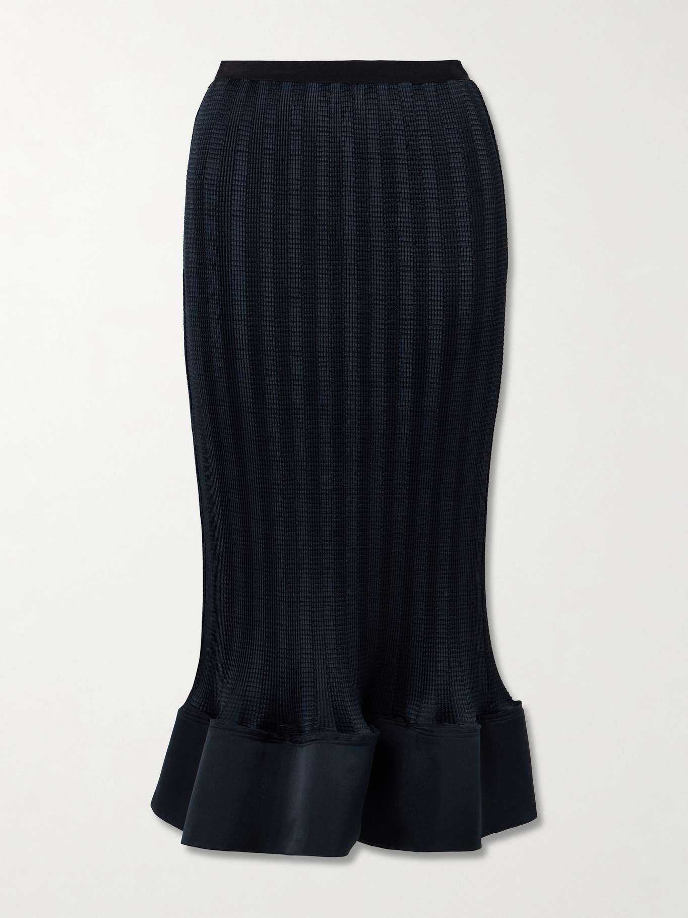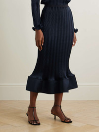 EDITORS'NOTES SIMKHAI interprets everyday staples through a modern lens, which results in exquisite designs like this sculptural 'Hollis' skirt. It's made from satin that's shirred for a curve-hugging fit and orbited with a ruffled hem. Wear yours with the coordinating top. SIZE & FIT Model measurements: - Fits true to size, however those who are between sizes should take the smaller size - Midi-length, designed to be worn at the waist - Elasticated at the waist for a flexible fit - Mid-weight, slightly stretchy fabric - Model is 175cm/ 5'9" and is wearing a US 2 - Bust: 81cm/ 32" - Waist: 65cm/ 25.5" - Hip: 99cm/ 39" DETAILS & CARE - Black satin - Pull on - 100% polyester; lining: 95% polyester, 5% spandex - Dry clean