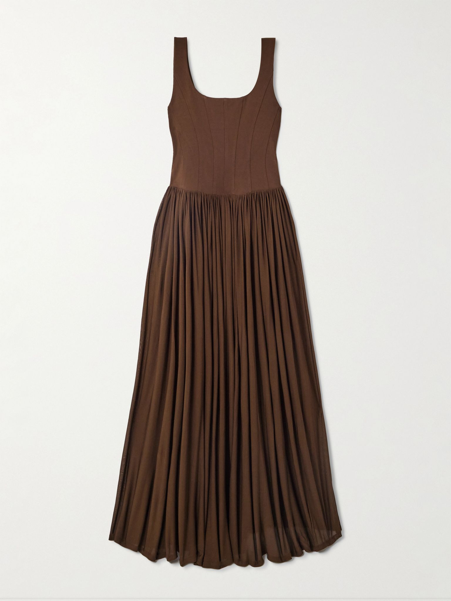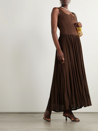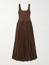 It's the small touches that make Simkhai's dress as considered as it looks. Made from jersey, it has a clean, square neckline and paneled bodice that sculpts and defines your shape. The skirt is delicately gathered, so it sways beautifully through the length. Size & Fit - Fits true to size, however those who are between sizes should take the smaller size - Designed to be fitted at the bust and waist, loose at the hip - Mid-weight, slightly stretchy fabric - Model is 177cm/ 5'10" and is wearing a US 2 Model measurements: - Bust: 80cm/ 31.5" - Waist: 60cm/ 23.5" - Hip: 89cm/ 35" Details & Care - Brown jersey - Zip fastening along back - 100% cotton - Dry clean - Designer color: Cocoa