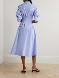 EDITORS'NOTES SIMKHAI's 'Jazz' shirt dress is darted at the waist to create pleats through the skirt. Made from cotton-blend poplin, it has a classic collar and three-quarter-length sleeves. Style yours with ballet flats in the city or strappy sandals on vacation. SIZE & FIT Model measurements: - Fits true to size, take your normal size - Designed to be slightly fitted at the bust and waist, loose at the hip - Mid-weight, non-stretchy fabric - Model is 180cm/ 5'11" and is wearing a size XSmall - Bust: 80cm/ 31.5" - Waist: 65cm/ 25.5" - Hip: 89cm/ 35" DETAILS & CARE - Periwinkle cotton-blend poplin - Partially concealed button fastenings through front - 63% cotton, 37% polyester; lining: 100% cotton - Machine wash - Designer color: French Blue