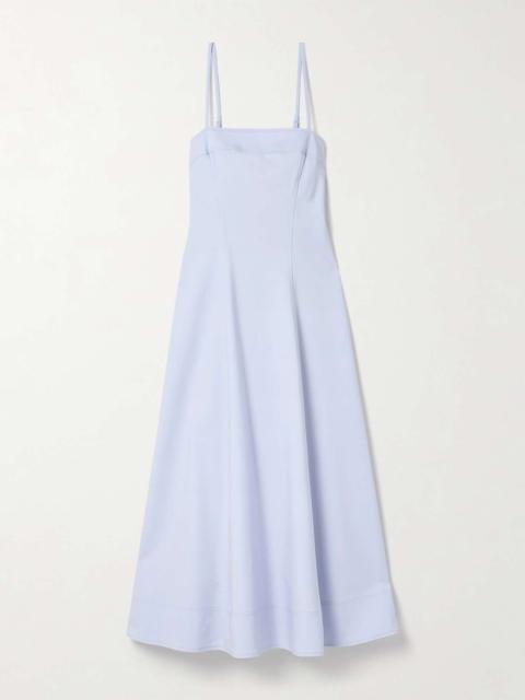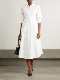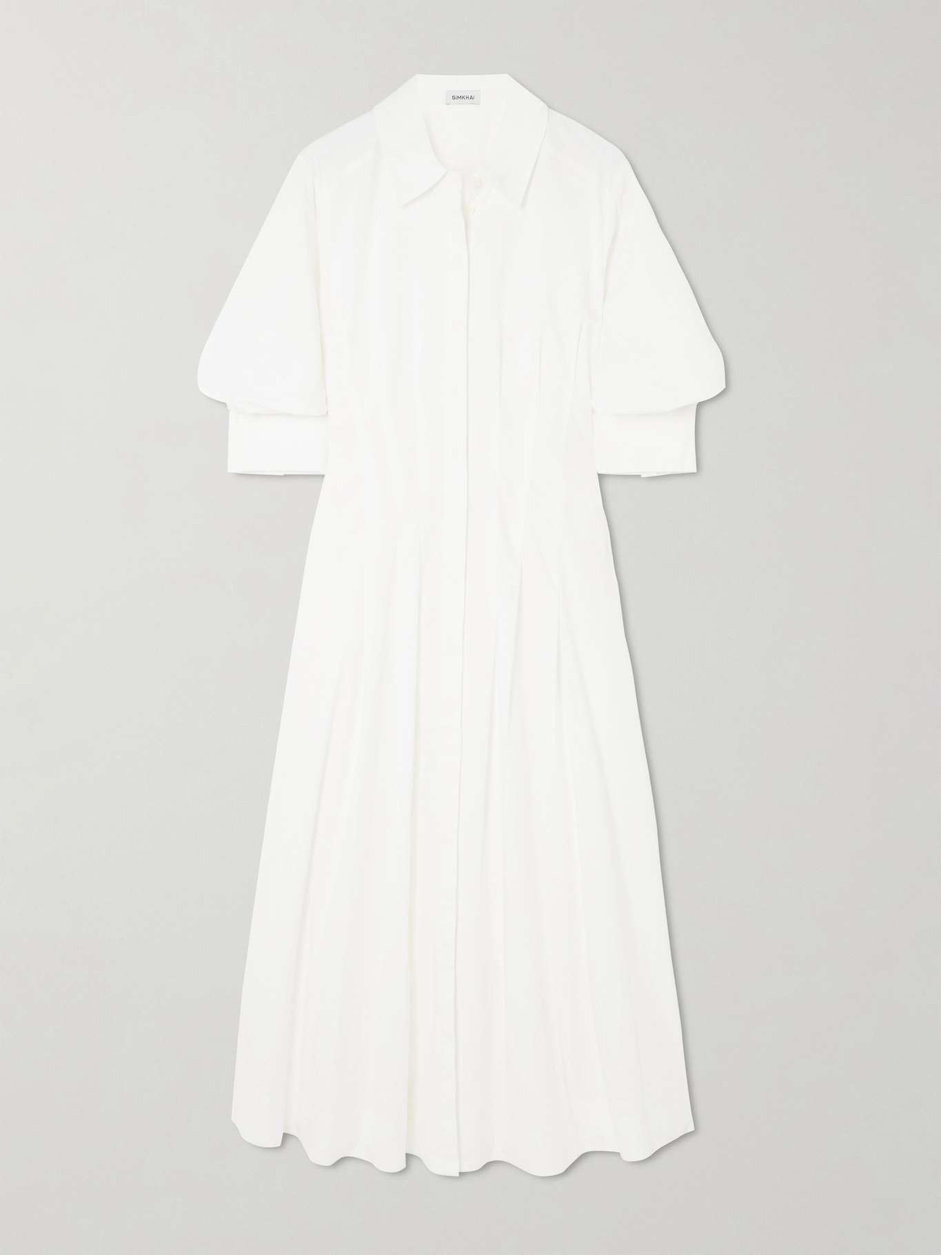 EDITORS'NOTES SIMKHAI updates the classic shirt dress with a darted, nipped-in waist that creates pleats through the full skirt. This 'Jazz' style is made from cotton-blend poplin and has voluminous short sleeves and a smart collar. Wear it with strappy sandals or sneakers. SIZE & FIT Model measurements: - Fits true to size, take your normal size - Designed for a slightly loose fit - Mid-weight, non-stretchy fabric - Model is 177cm/ 5'10" and is wearing a size Small - Bust: 81cm/ 32” - Waist: 67cm/ 26.5” - Hip: 91cm/ 36” DETAILS & CARE - White cotton-blend poplin - Partially concealed button fastenings through front 63% cotton, 37% polyester; lining: 82% rayon, 18% nylon - Machine wash