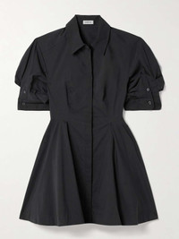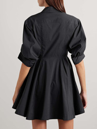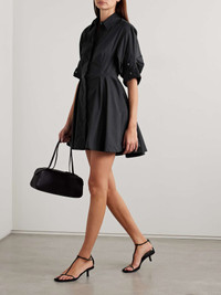 EDITORS'NOTES SIMKHAI's 'Jazzie' mini dress is modeled on chic shirt styles. It’s made from crisp cotton-blend poplin and cinches at the waist before flaring to a flared skirt. Wear yours with strappy sandals. SIZE & FIT Model measurements: - Fits true to size, take your normal size - Intended to be fitted at the bust and waist, loose at the hip - Particularly short in length - Lightweight, slightly stretchy fabric - Model is 180cm/ 5'11" and is wearing a US 2 - Bust: 81cm/ 32” - Waist: 62cm/ 24.5” - Hip: 88cm/ 34.5” DETAILS & CARE - Black cotton-blend poplin - Partially concealed button fastenings through front - 63% cotton, 37% polyester; lining: 100% cotton - Machine wash
