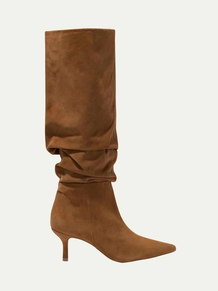 SIMKHAI "Jordi" chic slouchy boots in calf suede 2.50 in / 65mm kitten heel Pointed toe Pull-on style Sheep leather lining Leather outsole Imported Online Inquiries: BGS21_X6ZKP| Store Inquiries: #5072502