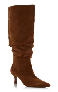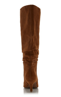 PRODUCT DETAILS - Heeled knee boot silhouette, suede slouchy body, pointed toe, lined - Pull on - Composition: upper: 100% kid suede; lining: 100% sheepskin; outsole: 100% leather - Made in Brazil