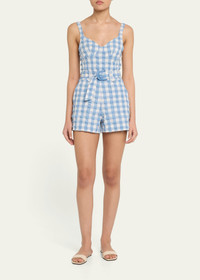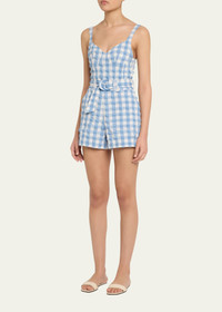 SIMKHAI "Kai" bustier romper in a textured gingham pattern V neckline Sleeveless Removable D-ring belt Side and back pockets Relaxed legs Concealed side zipper Polyester Imported Online Inquiries: BGS21_T6K2C| Store Inquiries: #4995067