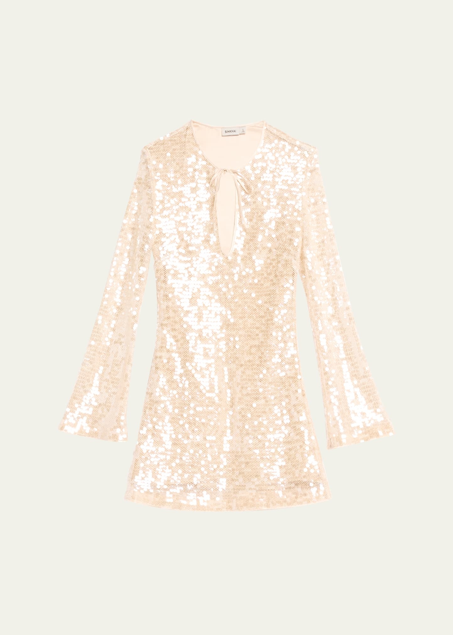 SIMKHAI "Kari" streamlined dress coated in shimmering sequins Approx. 33"L from shoulder to hem Round neckline; self-tie/keyhole front Long sleeves Hem falls above the knee Sheath silhouette Concealed back zipper Polyester/viscose Lining: Polyester/spandex Dry clean Imported Model is 5'10"/177cm. Online Inquiries: BGS21_T5SKS| Store Inquiries: #4809865