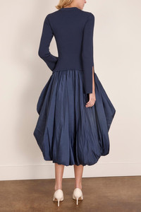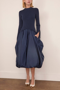 The Simkhai Kenlie Long Sleeve Mock Neck Midi Dress is perfect for an evening out. You'll love the fitted knit bodice of this midi dress with the contrasting taffeta bubble skirt. Wear yours with heels and a clutch. - Midi length - Fit and flare silhouette - Knit bodice - Taffeta skirt - Bubble hemline - Side sleeve slits - 100% Viscose