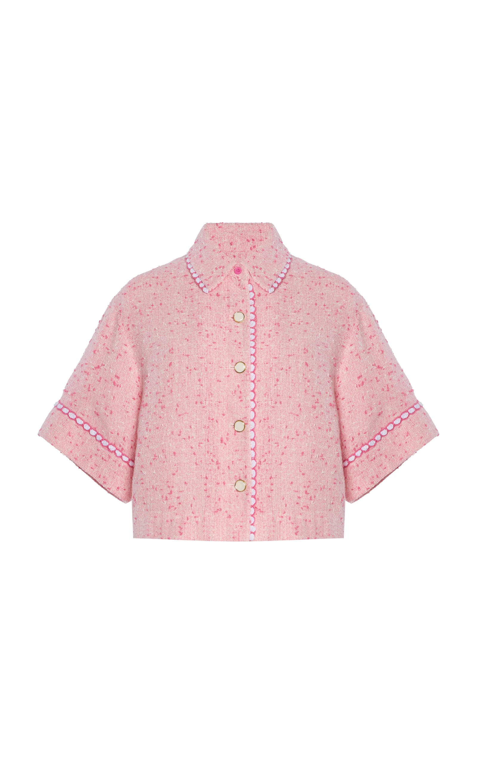 Simkhai's range of luxury swimwear makes a statement on the beach. This textured tweed short-sleeve button-down is designed as a sophisticated cover-up. Its structured silhouette and refined details make it a seamless transition piece. Pair with the matching skirt. PRODUCT DETAILS - Pre-Fall '25 - Button fastening - Composition: 37% polyester, 36% acrylic, 27% rayon; Lining: 100% cotton - Designer color: Berry - Dry clean - Imported SIZE & FIT - Our model is wearing a size Small - Model is 5'10" with a 30" bust, 24" waist, and 34" hip - Designed for a relaxed fit