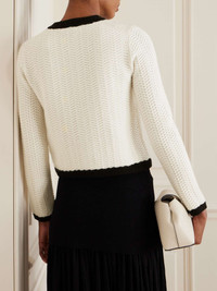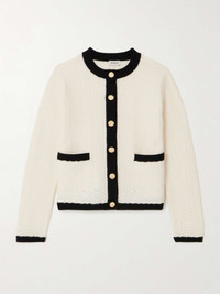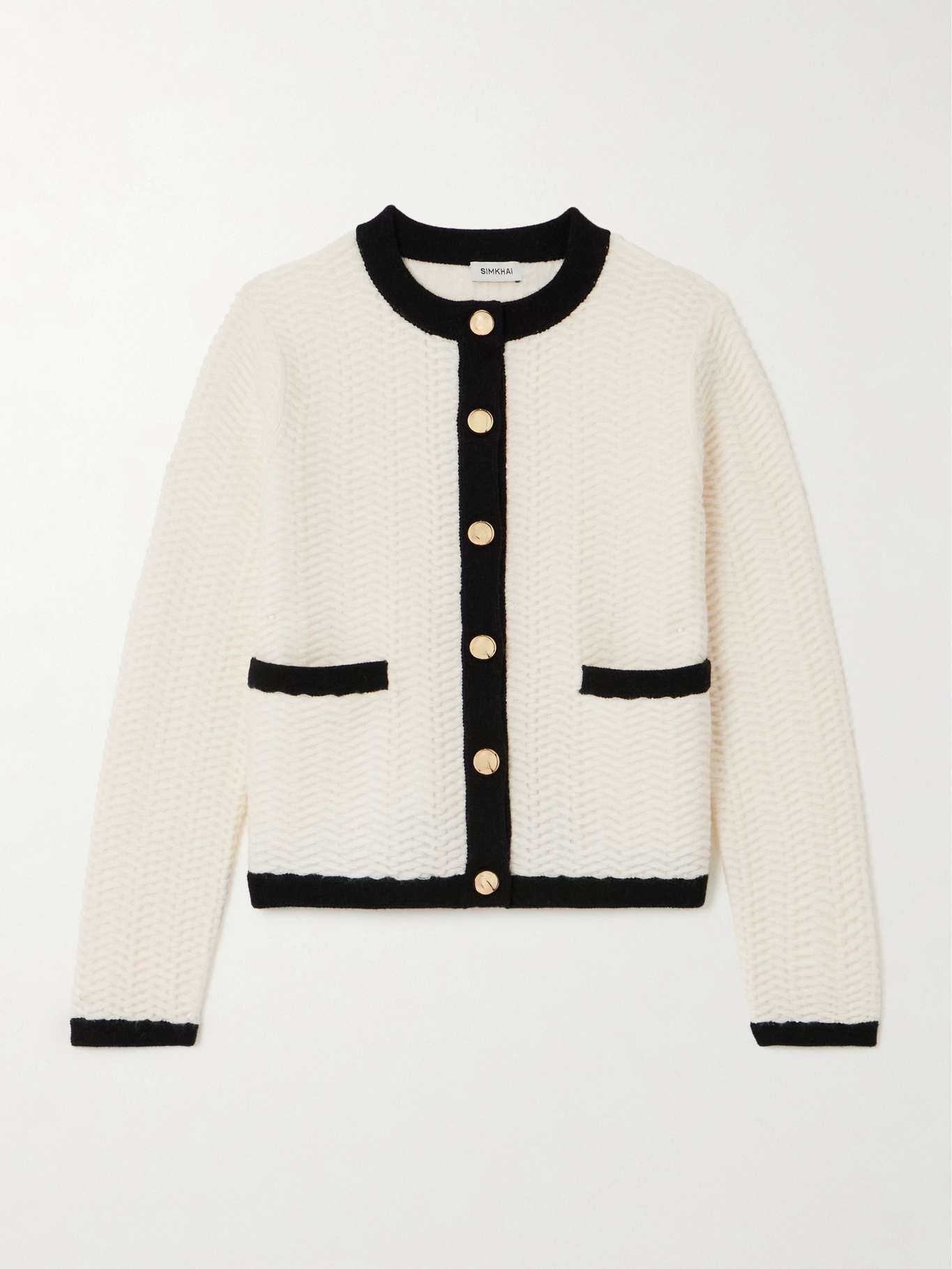 SIMKHAI's 'Klaire' cardigan has a chic, vintage-inspired feel. It's knitted from wool and cashmere-blend in a textural chevron stitch and has a slim shape outlined with contrasting black trims. Gold-tone buttons decorate the patch pockets. Size & Fit - Fits true to size, take your normal size - Designed for a slim fit - Lightweight knit - Model is 180cm/ 5'11" and is wearing a size Small Model measurements: - Bust: 85cm/ 33.5" - Waist: 62cm/ 24.5" - Hip: 88cm/ 34.5" Details & Care - Black and white wool and cashmere-blend - Button fastenings through front - 90% wool, 10% cashmere - Dry clean