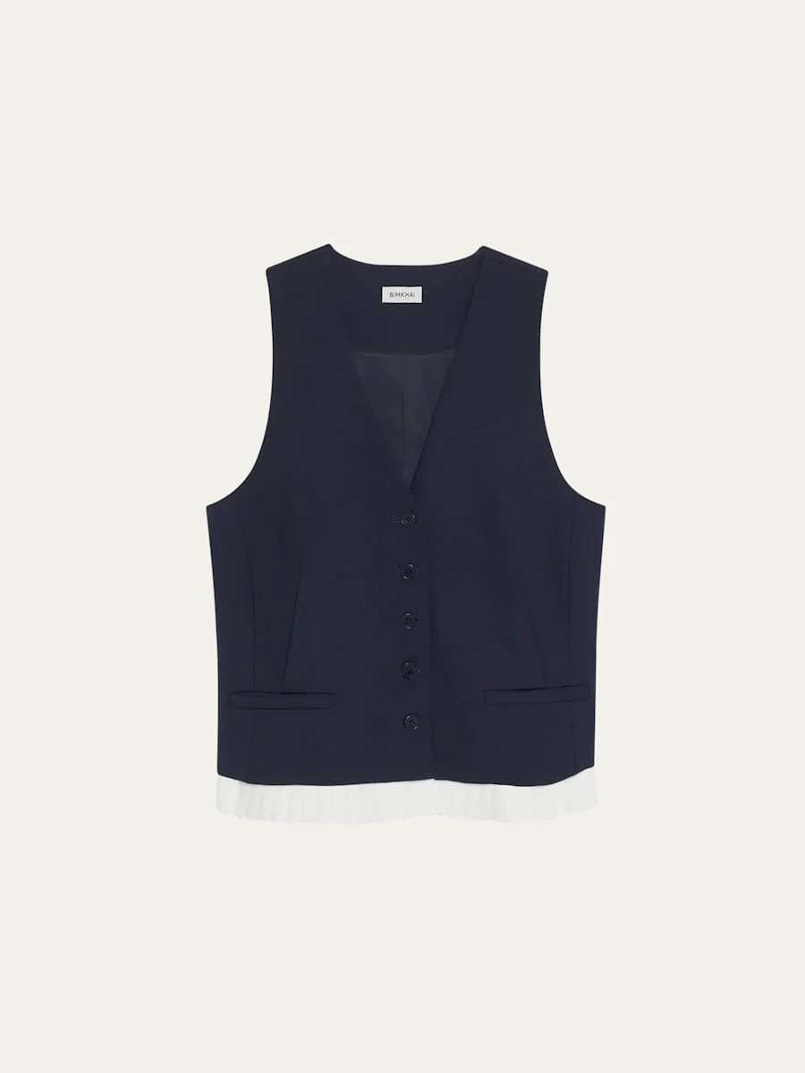 SIMKHAI "Laiken" suiting vest finished with a contrasting pleated hem in cashmere-blend V neckline Sleeveless Welt pockets Tailored fit Hem sits at the hip Button-front Cotton/cashmere Imported Online Inquiries: BGS21_T6WYT| Store Inquiries: #5056761