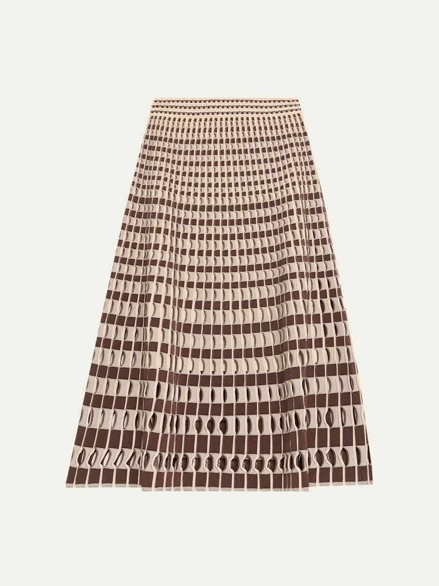 SIMKHAI "Larken" midi skirt featuring lasercut detailing High rise Elastic waistband Aline silhouette Hem falls below the knee Pullon style Rayon/cellulose acetate/polyester Dry clean Imported