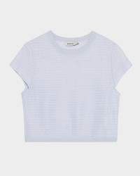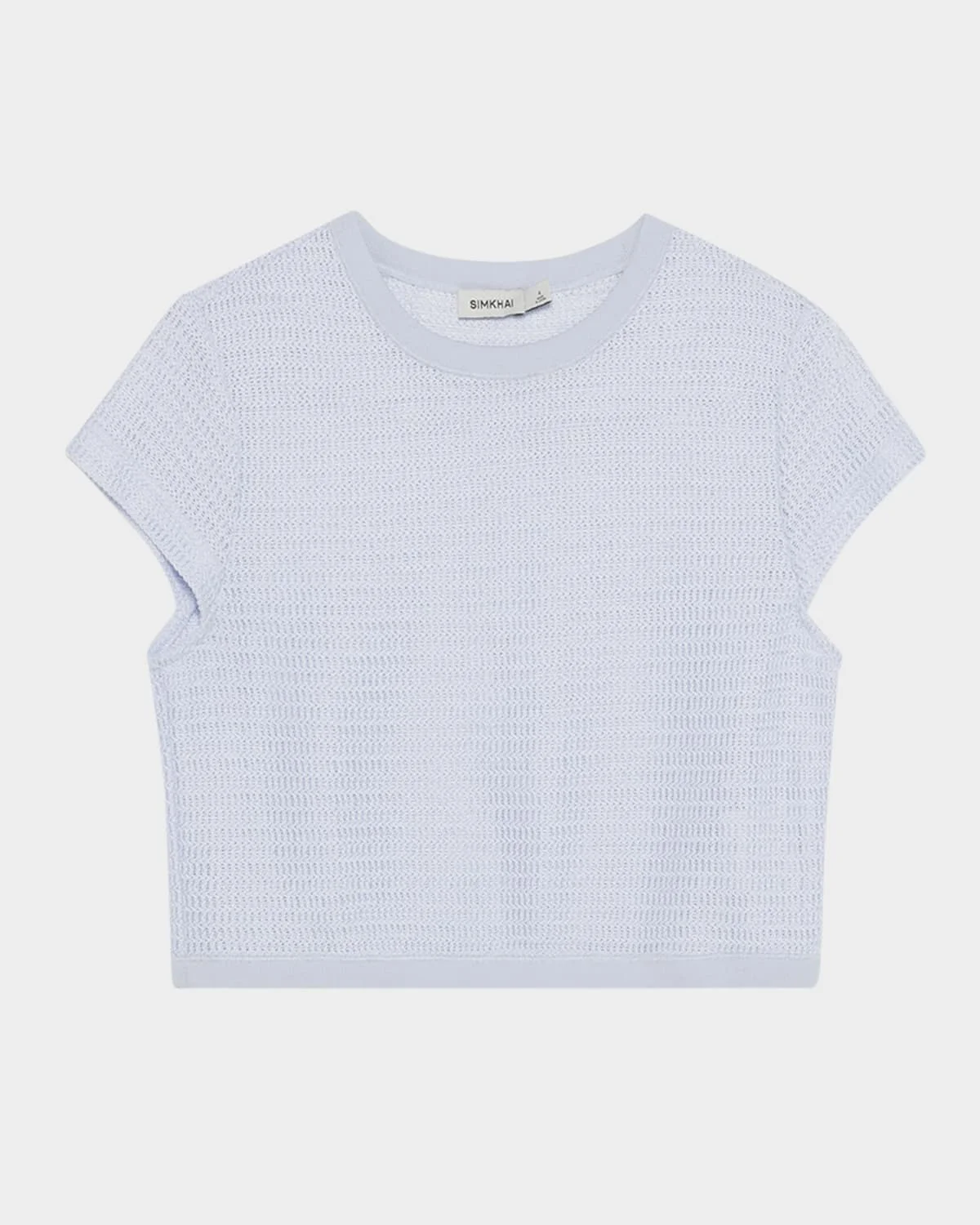 - SIMKHAI "Lidie" top in a semi-sheer knit construction - Crew neckline - Short sleeves - Cropped hem - Relaxed fit - Pullover style - Polyester/viscose/polyester - Dry clean - Made in USA