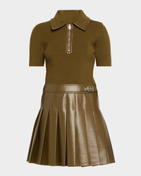 SIMKHAI "Linnie" combo mini dress elevated with a ribbed bodice and pleated vegan leather skirt Point collar; zipfront Short sleeves Side buckle detail Shirtdress silhouette Hem falls above the knee Invisible side zip Polyurethane/polyester Dry clean Imported