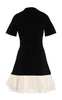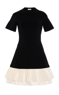 PRODUCT DETAILS - Slim fit, rounded neckline and short sleeves, ruffled A-line silhouette mini - Pull Over - Lined - Composition: Shell: 83% Recycled Viscose 17% Elastic, Combo: 70% Polyester 30% Nylon - Color: black/white - Dry Clean Only - Fall-Winter '25