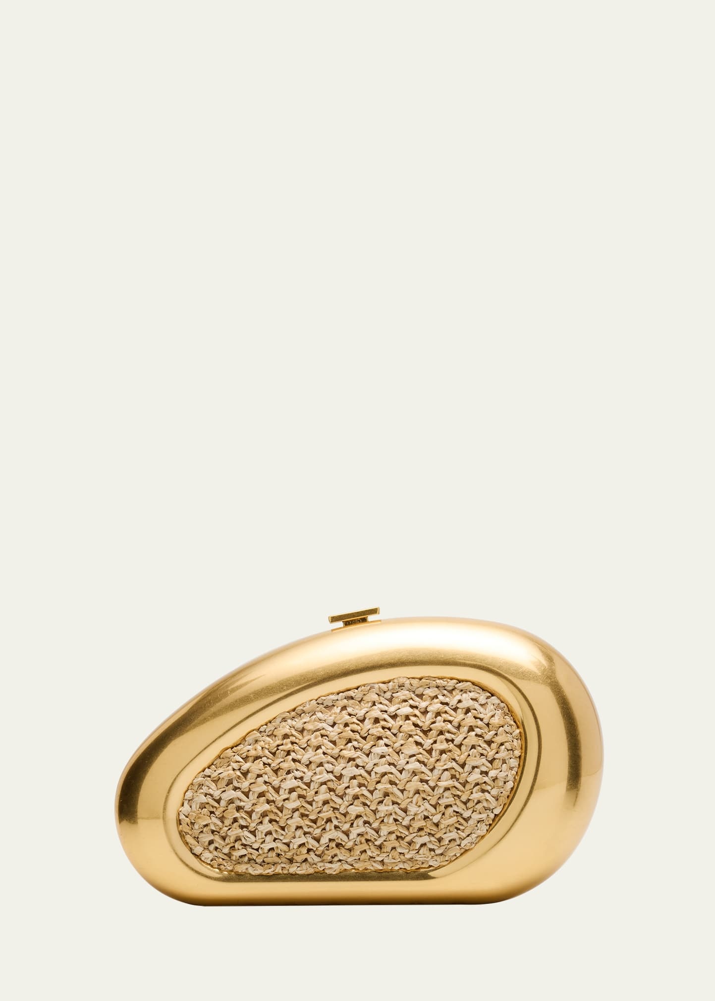 SIMKHAI "Luna" oval metal clutch bag with raffia-like woven fabric trim Detachable chain shoulder strap, 20.5" drop Can be worn as a clutch or shoulder bag Framed top with clasp closure Approx. 4.6"H x 8.1"W x 2"D Aluminum/paper Imported Online Inquiries: BGS21_V6GYM| Store Inquiries: #4990440