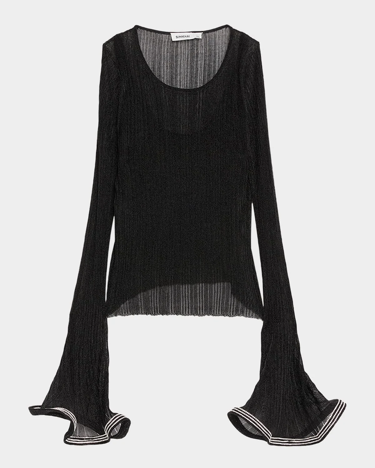 SIMKHAI "Maebry" lightweight ribknit top finished with contrast topstitching Crew neckline Long sleeves with flared cuffs Slim fit Hem sits at the hip Pullover style Viscose/polyester Lining: Viscose Dry clean Imported