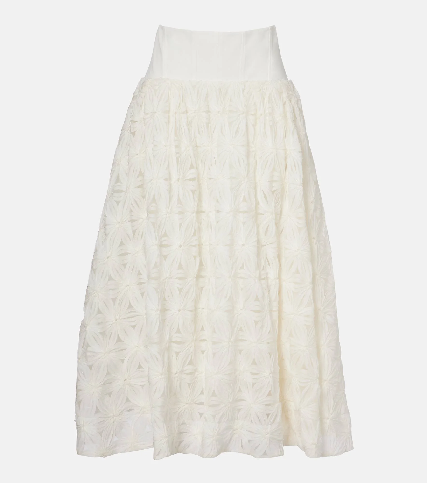 Inspired by sculpture and architecture, Simkhai's designs combine innovative construction with hand-detailing. The Mindy midi skirt is crafted from embroidered fabric and features a voluminous silhouette. Product Details - Material: 100% polyester - Care instructions: dry clean - Made in China - Color: white - Designer color name: Ivory - Item color: white - Details: 79% rayon, 15% nylon, 6% elastane - Lining: 100% polyester - Closure: concealed zipped side - Item number: P01125143 Size & Fit - Fits large to size - we recommend trying one size smaller - Non-stretchy fabric - The model seen in the picture is 178cm-5'10" and wearing a size US 2