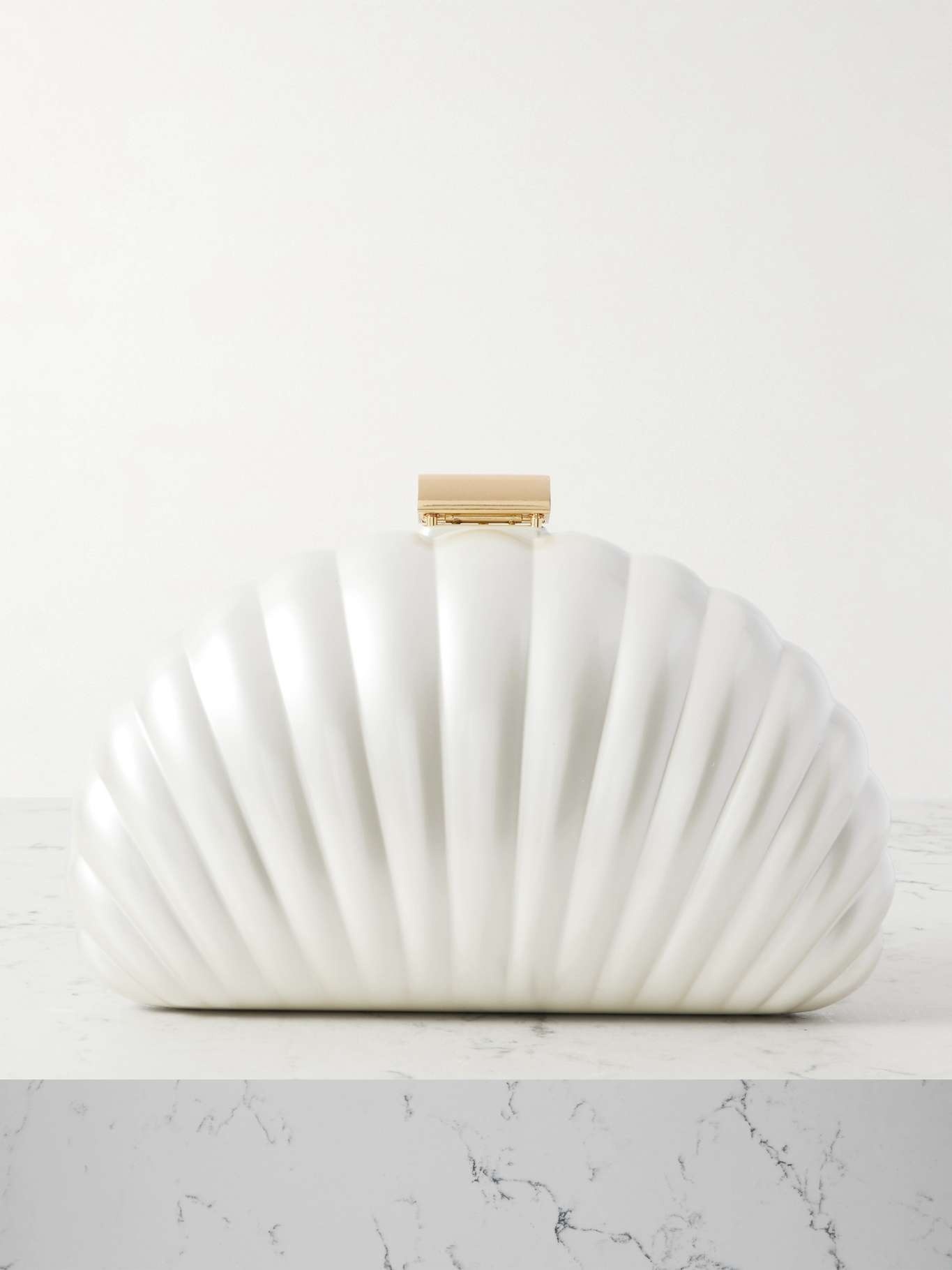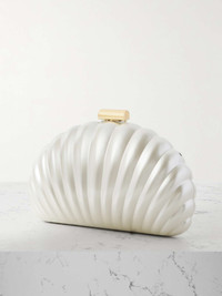 EDITORS'NOTES Vacations call for summery accessories like SIMKHAI's 'Monet' clutch. It's crafted from pearlescent resin in the shape of a shell and detailed with a gold-tone clasp and matching detachable strap to go hands-free. The suede-lined interior has just enough space for your smartphone, cardholder and keys. SIZE & FIT This item’s measurements are: - Height: 14cm / 5.5in - Width: 21cm / 8.3in - Depth: 4cm / 1.6in DETAILS & CARE - Ivory resin - Detachable shoulder strap - Suede lining - Clasp fastening at top