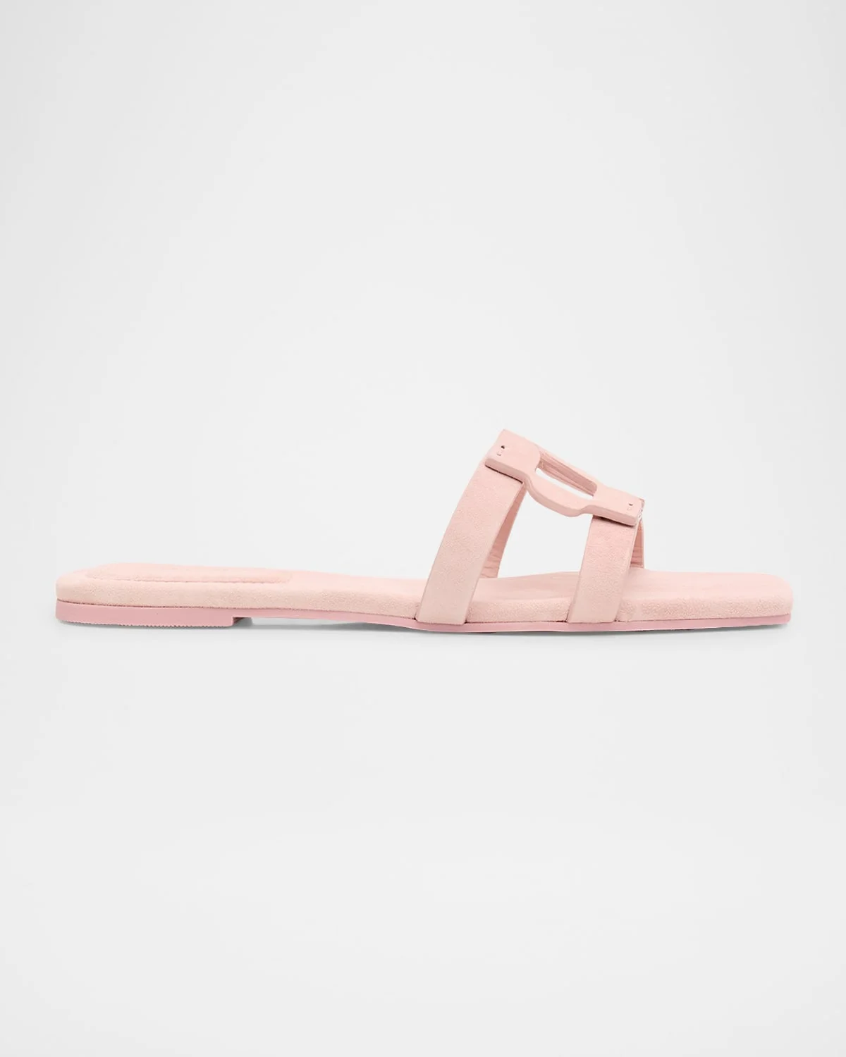 Made in soft suede, these sandals by SIMKHAI feature the brand's iconic "S" motif Flat heel Squared open toe Easy slide style Made in Italy