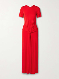 SIMKHAI's 'Nalani' gown has long ties that wrap around the front of your waist and create a pretty drape. It's cut from stretch-jersey and has a close, body-hugging fit. Complement the vibrant red with warm gold jewelry. Size & Fit - Fits true to size, take your normal size - Designed for a slim fit - Lightweight, stretchy fabric - Model is 180cm/ 5'11" and is wearing a US 2 Model measurements: - Bust: 81cm/ 32” - Waist: 62cm/ 24.5” - Hip: 88cm/ 34.5” Details & Care - Red stretch-jersey - Concealed hook and zip fastening at back - 96% rayon, 4% spandex - Dry clean - Designer color: Fiery Red