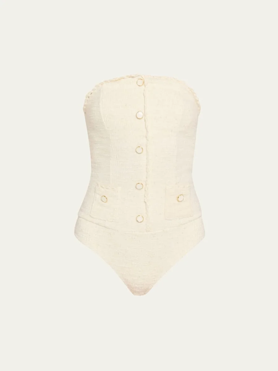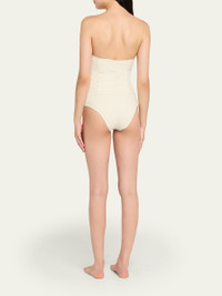 SIMKHAI "Natalie" textured bandeau one-piece swimsuit accented with crochet trim and button detailing Strapless neckline; button front Dual buttoned patch pockets Moderate seat coverage Polyester/spandex/nylon/polyamide Hand wash or dry clean Imported Online Inquiries: BGS21_T6RUU| Store Inquiries: #5027523