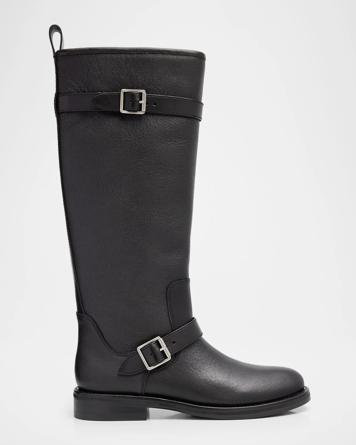 SIMKHAI "Noah" calf leather kneehigh boots with buckle straps on the vamp and collar 1.00 in / 25 mm stacked flat heel Round toe Pulltab on back of collar Zip closure for easy on/off Leather outsole Imported