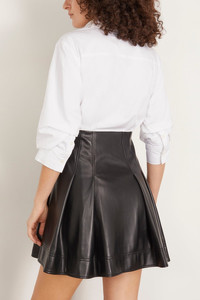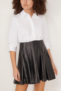 The Simkhai Padma Poplin Combo Mini Dress offers a sophisticated flare to your wardrobe. This mini dress has a pleated faux leather skirt with a contrasting cotton poplin button down top. Wear yours with loafers and a shoulder bag. FIT DESCRIPTION MODEL MEASUREMENTS - Fits true to size, take your normal size - Mini dress - Mixed material - Faux leather pleated skirt - Cotton poplin top - Concealed side zipper - 50% Polyurethane 50% Polyester, Combo: 100% Cotton, Lining: 60% Viscose 40% Rayon - Taylor is wearing a size 2 - Bust: 33.5" - Waist: 27.5" - Hips: 36.5" - Height: 5’9”