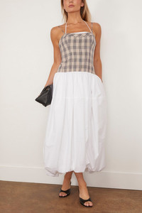 The Simkhai Pfeiffer Sleeveless Bustier Midi Dress is a must-have piece from their Spring 25 Collection. This dress features a bustier bodice in a gingham print with a flowing skirt. Wear yours with sandals and a tote bag. FIT DESCRIPTION MODEL MEASUREMENTS - Fits true to size, take your normal size - Midi length - Bustier bodice - Drop waistline - Full skirt - Concealed zipper - Viscose/polyester/elastane - Charley is wearing a size 2 - Bust: 33” - Waist: 25” - Hips: 34” - Height: 5’8”