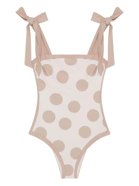 polka-dot tie-detail swimsuit Highlights - Beige - Polka dot pattern - Tie shoulder straps - Square neckline - Be mindful to try on swimwear over your own garments. Imported Composition Recycled Nylon 80%, Spandex/Elastane 20% Washing instructions Hand Wash